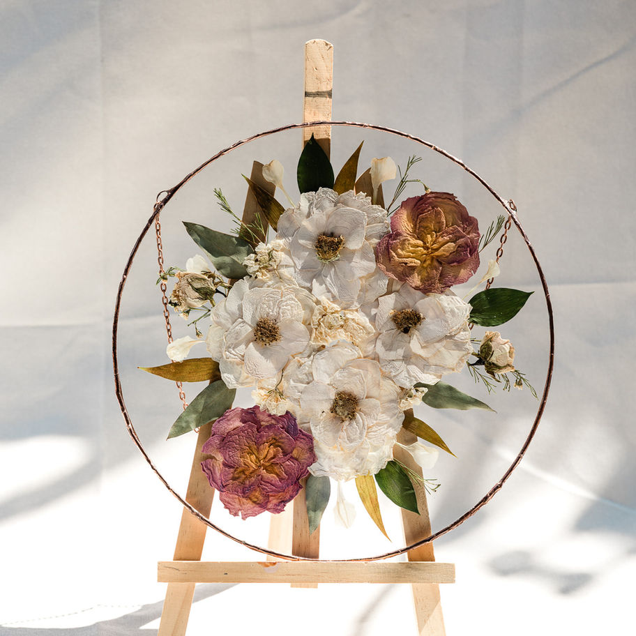 This circular frame comes in two sizes: 11 inches and 15 inches. Both are perfect for showcasing your flowers in a beautiful, lasting way.