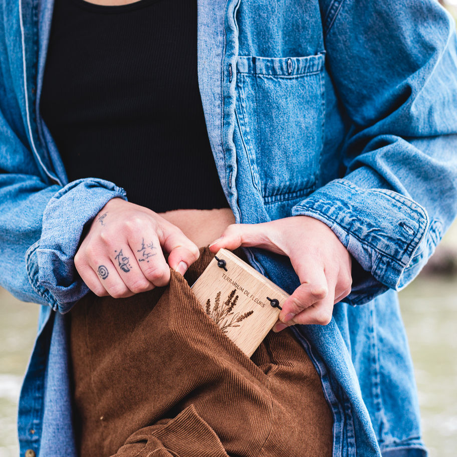 This pocket-sized flower presser is perfect for hikes, road trips, and spontaneous moments in nature. Crafted with care, each presser features local oak wood hand-drilled by 8Woodworks, and a thoughtfully assembled interior by Terrarium de Fleurs. Inside, you'll find 2 layers of cardboard and 7 layers of hand-cut blotter paper—perfect for preserving your floral finds on the go.