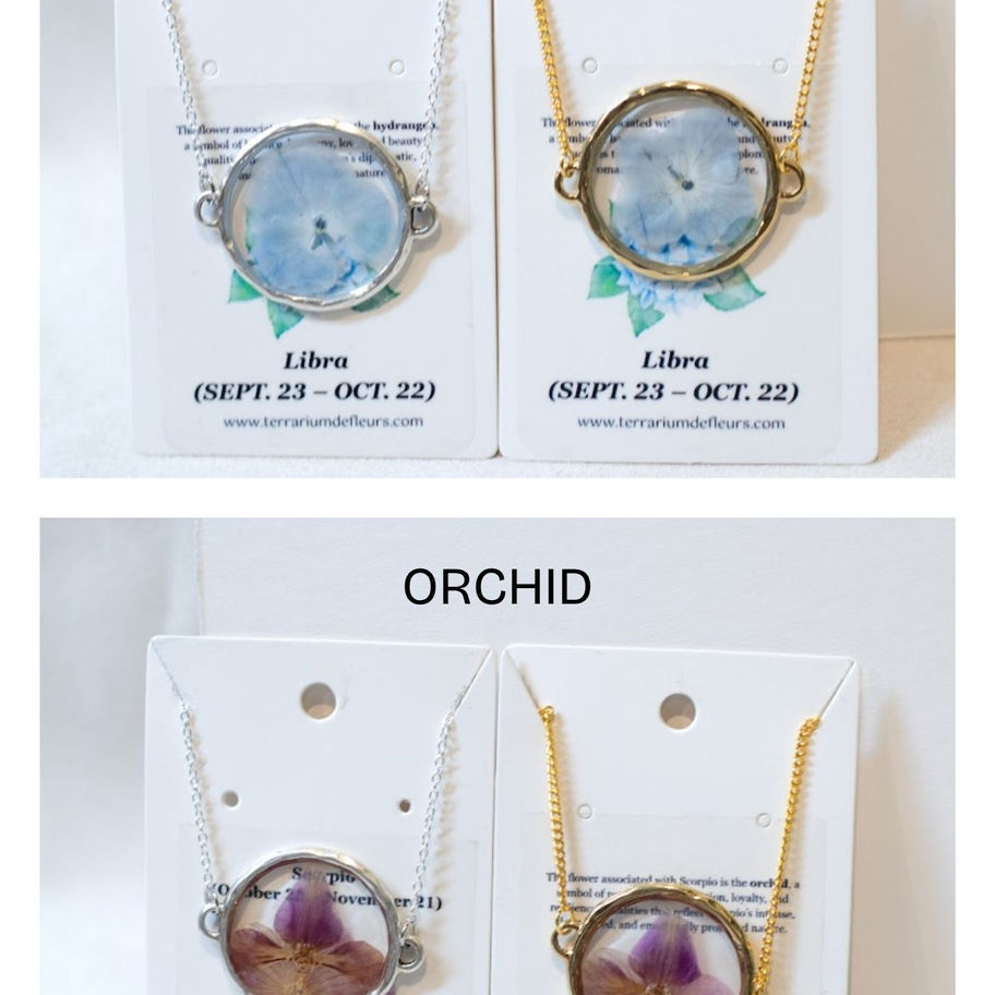 These unique zodiac pendants feature a beautiful real flower associated with each zodiac sign, meticulously crafted with a one-of-a-kind design. The pendant is antique silver-plated or gold-plates, nickel and lead-free, and includes a silver-plated 18-inch chain.